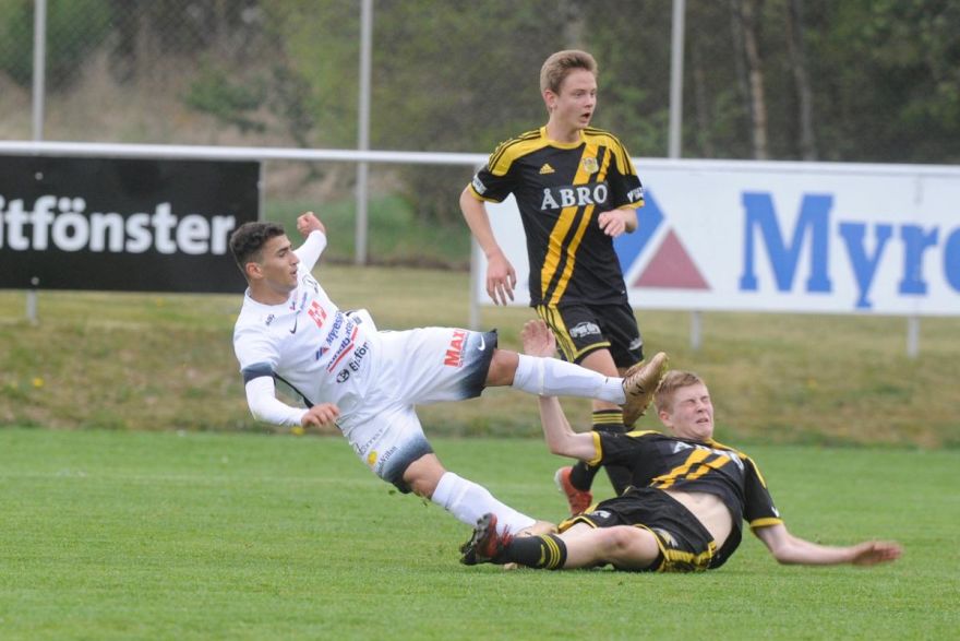 Bild från Vetlandaposten. Glidtackling utförd av Oskar Bergman, beundrad av Isak Granström.
